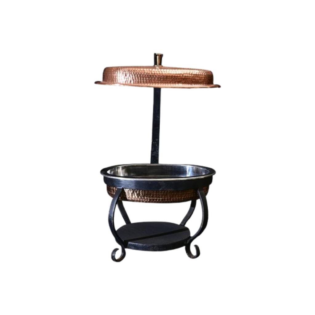 Canan copper dish is an amalgamation of traditional and contemporary design.  Wrought iron stand compliments the look along with beaten work. Dish comes with removable stainless-steel tub which is oven and dishwasher safe.